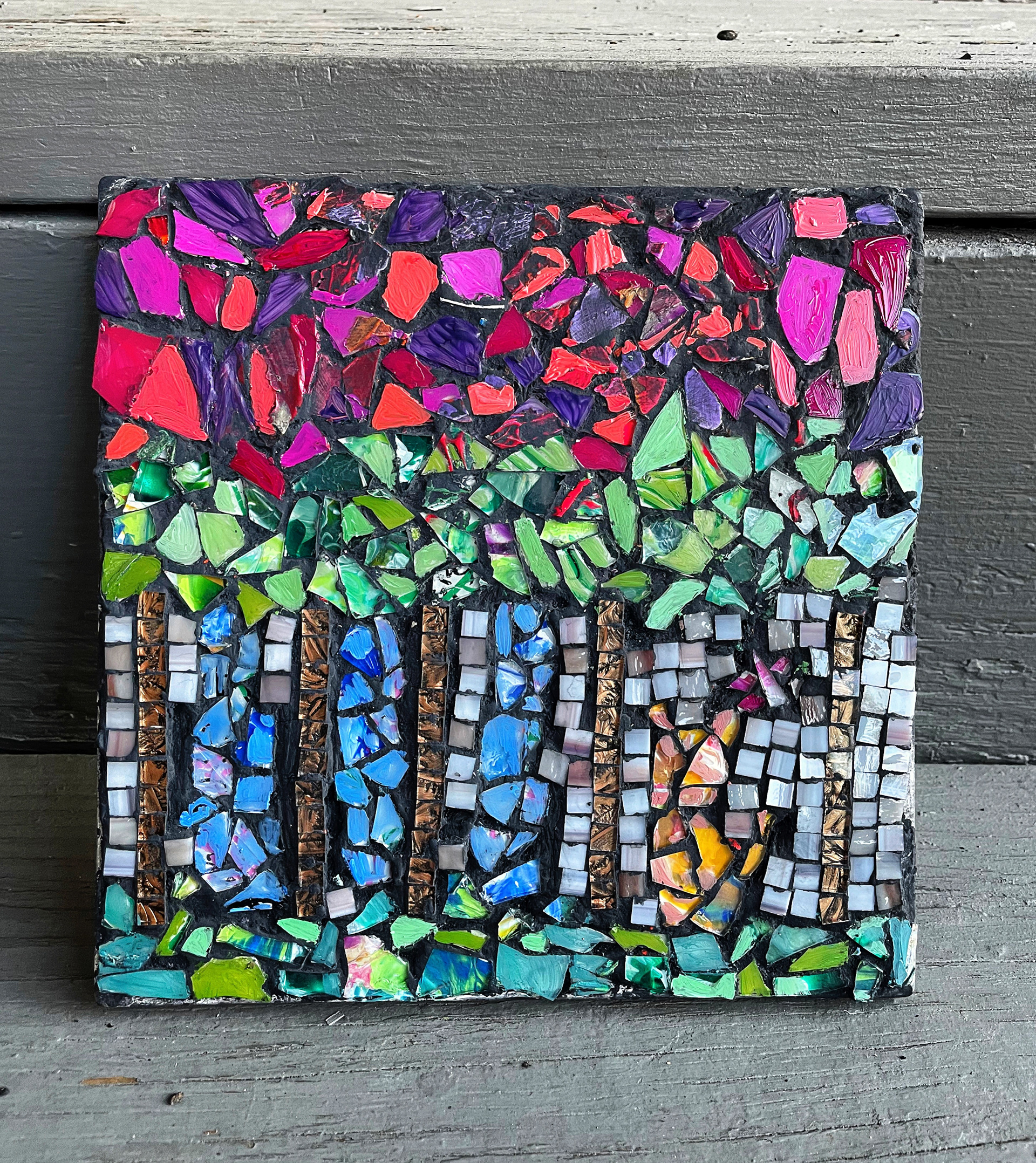 Materials: tiles, glass, acrylic paint, mosaic glue, grout