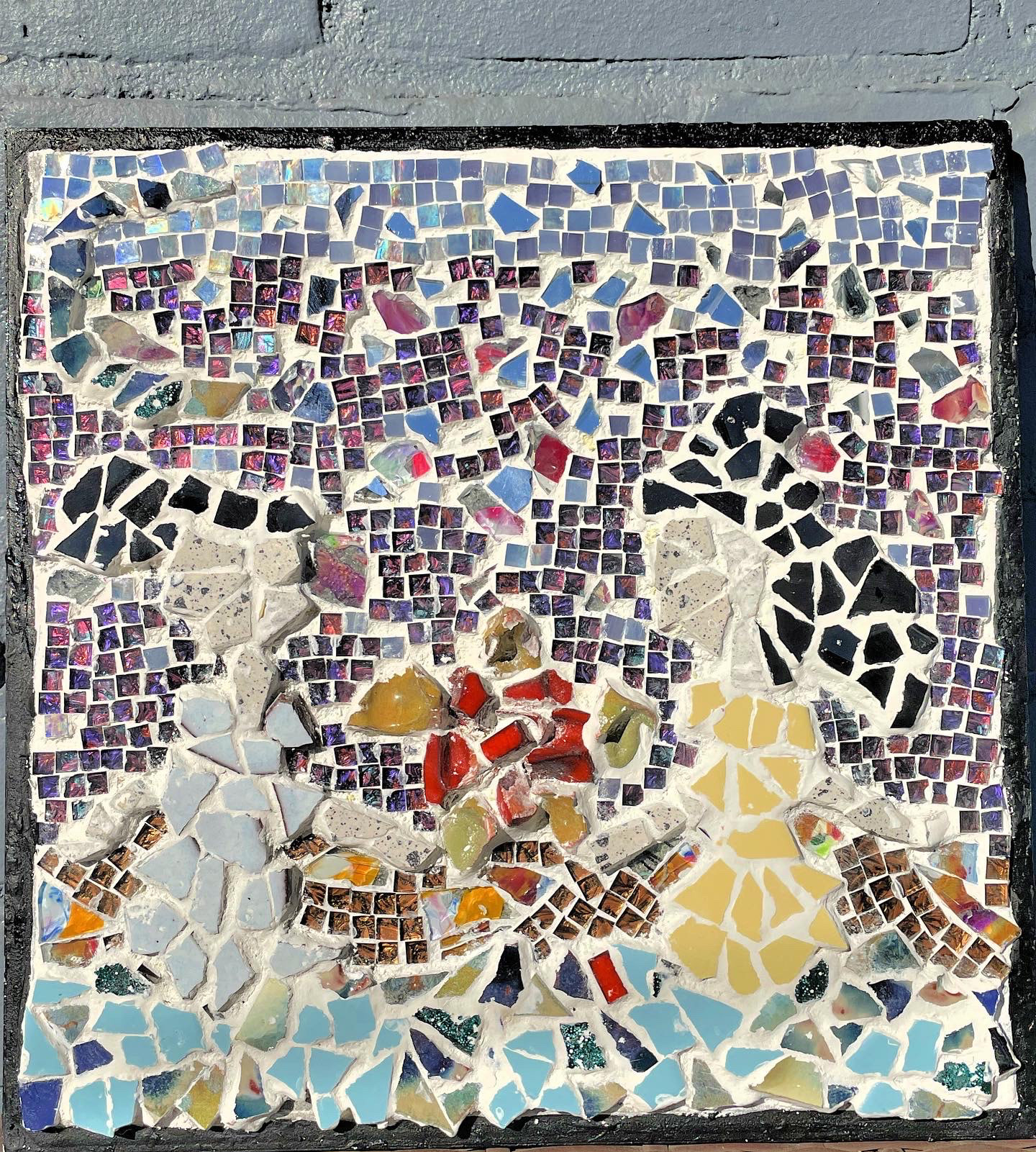 Materials: tiles, mirror shards, glass, black acrylic paint, mosaic glue, grout
